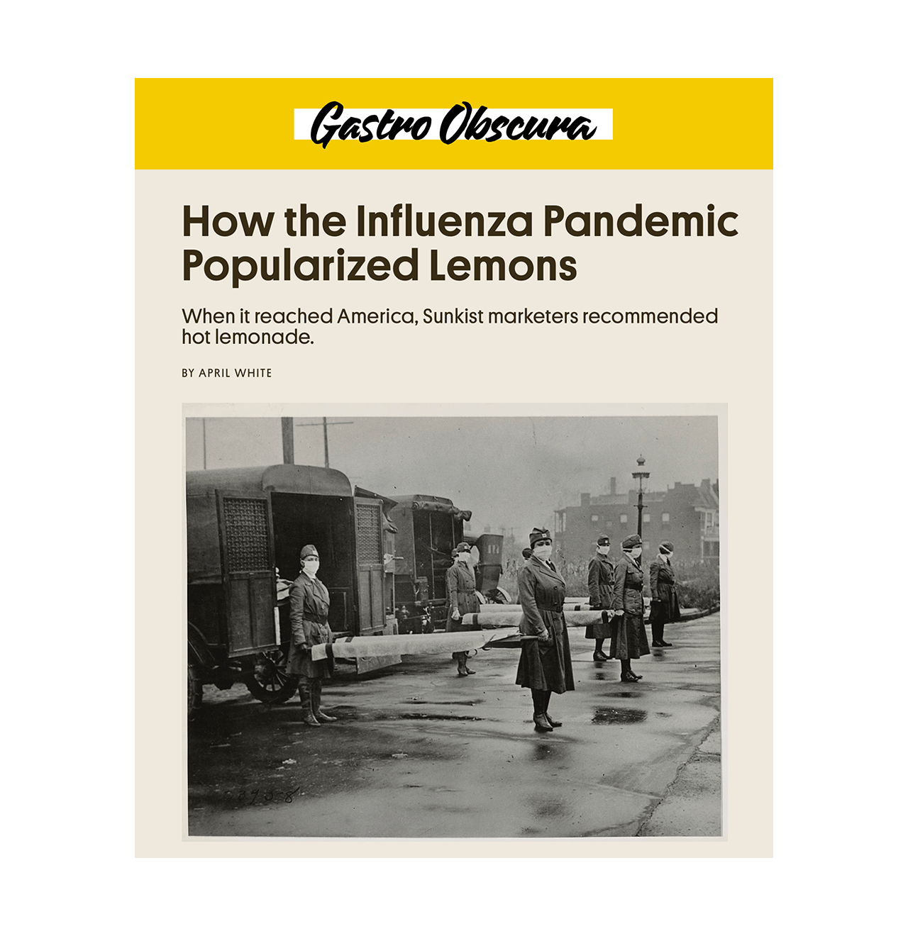 In the fall of 1918, as influenza spread across the globe and the world clamored for a cure, the price of lemons skyrocketed. From Rome to Rio to Boston, residents desperate for any small measure of protection hoarded the yellow fruit, which was said—by whom it was, even then, unclear—to be both a prophylactic and a remedy for the deadly virus. Newspaper articles promised the citrus was a “flu foe,” and announced “lemon sucking now hailed by science as influenza cure.” It wasn’t true, of course, but the story was still good news for one segment of the population: California’s lemon farmers.